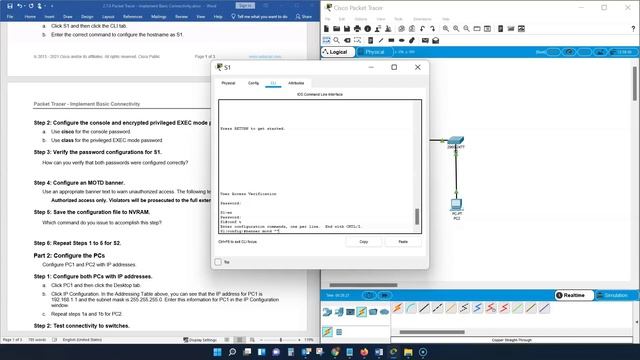 2.7.6 Packet Tracer - Implement Basic Connectivity Objectives Part 1: Perform a Basic Configuration on S1 and S2 Part 2: Configure the PCs Part 3: Configure the Switch Management Interface Background In this activity, you will first create a basic switch configuration. Then, you will implement basic connectivity by configuring IP addressing on switches and PCs. When the IP addressing configuration is complete, you will use various show commands to verify the configuration and use the ping command to verify basic connectivity between devices. Instructions Part 1: Perform a Basic Configuration on S1 and S2 Complete the following steps on S1 and S2. Step 1: Configure S1 with a hostname. a. Click S1 and then click the CLI tab. b. Enter the correct command to configure the hostname as S1. Step 2: Configure the console and encrypted privileged EXEC mode passwords. a. Use cisco for the console password. b. Use class for the privileged EXEC mode password. Step 3: Verify the password configurations for S1. How can you verify that both passwords were configured correctly? Step 4: Configure an MOTD banner. Use an appropriate banner text to warn unauthorized access. The following text is an example: Authorized access only. Violators will be prosecuted to the full extent of the law. Step 5: Save the configuration file to NVRAM. Which command do you issue to accomplish this step? Step 6: Repeat Steps 1 to 5 for S2. Part 2: Configure the PCs Configure PC1 and PC2 with IP addresses. Step 1: Configure both PCs with IP addresses. a. Click PC1 and then click the Desktop tab. b. Click IP Configuration. In the Addressing Table above, you can see that the IP address for PC1 is 192.168.1.1 and the subnet mask is 255.255.255.0. Enter this information for PC1 in the IP Configuration window. c. Repeat steps 1a and 1b for PC2. Step 2: Test connectivity to switches. a. Click PC1. Close the IP Configuration window if it is still open. In the Desktop tab, click Command Prompt. b. Type the ping command and the IP address for S1 and press Enter. Packet Tracer PC Command Line 1.0 ping 192.168.1.253 Were you successful? Explain. Part 3: Configure the Switch Management Interface Configure S1 and S2 with an IP address. Step 1: Configure S1 with an IP address. Switches can be used as plug-and-play devices. This means that they do not need to be configured for them to work. Switches forward information from one port to another based on MAC addresses. If this is the case, why would we configure it with an IP address? Use the following commands to configure S1 with an IP address. S1# configure terminal S1(config)# interface vlan 1 S1(config-if)# ip address 192.168.1.253 255.255.255.0 S1(config-if)# no shutdown S1(config-if)# S1(config-if)# exit Why do you enter the no shutdown command? Step 2: Configure S2 with an IP address. Use the information in the Addressing Table to configure S2 with an IP address. Step 3: Verify the IP address configuration on S1 and S2. Use the show ip interface brief command to display the IP address and status of all the switch ports and interfaces. You can also use the show running-config command. Step 4: Save configurations for S1 and S2 to NVRAM. Which command is used to save the configuration file in RAM to NVRAM? Step 5: Verify network connectivity. Network connectivity can be verified using the ping command. It is very important that connectivity exists throughout the network. Corrective action must be taken if there is a failure. Ping S1 and S2 from PC1 and PC2. a. Click PC1 and then click the Desktop tab. b. Click Command Prompt. c. Ping the IP address for PC2. d. Ping the IP address for S1. e. Ping the IP address for S2. Note: You can also use the ping command on the switch CLI and on PC2. All pings should be successful. If your first ping result is 80%, try again. It should now be 100%. You will learn why a ping may sometimes fail the first time later in your studies. If you are unable to ping any of the devices, recheck your configuration for errors. End of Document Commands: clock set = clock set 15:00:00 31 Jan 2035 copy running-config startup-config erase startup-config Configure terminal delete vlan.dat show clock show flash reload enable Exit End ping show show ip interface brief --------------------------------------- professorsistrunk@gmail.com