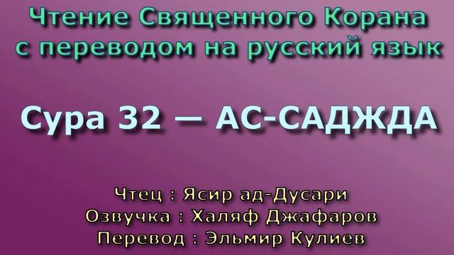 Чтение^Озвучка - Корана Чтец: Ясир ад-Дусари Озвучка: Халяф Джафаров Перевод: Эльмир Кулиев Источник YouTube канал: " Священный Коран "