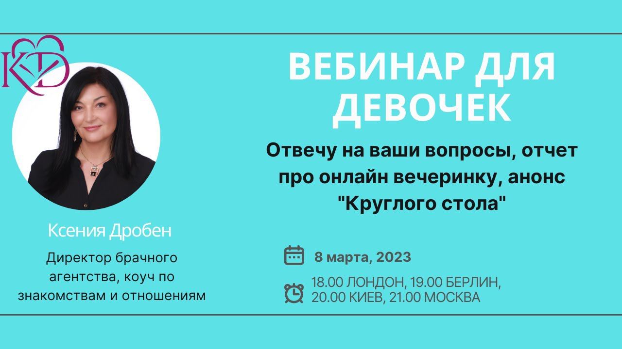 Сегодня у нас с вами опять «Посиделки у Ксюши» - традиционный вебинар по средам. Давайте отпразднуем 8 марта вместе – в нашем милом девчачьем кругу О чем мы будем сегодня разговаривать: - разбор и анализ ваших вопросов, которые накопились за последнюю неделю. - мой отчет о прошедшей онлайн вечеринке знакомств (если вы ее пропустили, то можете приобрести пакет «Вечеринка» за 1000 рублей. В пакет входят три видео и контакты мужчин, которые приняли участие. По вопросам приобретения пакета «Вечеринка» пишите, пожалуйста, Ларисе на Whatsapp +7 965 772-42-73 - Анонс «Круглого стола» на английском языке, который состоится 12 марта Вебинар-девичник состоится в среду, 8 марта 18.00 по Лондону, 19.00 по Берлину, 20.00 по Киеву, 21.00 по Москве Место встречи: Youtube: https://www.youtube.com/c/KseniaDrobenPartnervermittlung Или Facebook https://www.facebook.com/ksenia.droben/ Или Vkontakte https://vk.com/kseniadroben Или Instagram @kseniadroben Приходите на вебинар, у нас всегда весело ОДИН вопрос и ОДНА просьба: - если вы зарегистрированы в приложении Lovoo, напишите мне, пожалуйста, ваш ник там. Спасибо) - посмотрите, пожалуйста, новую серию нашего Датинг-шоу, поставьте лайк и напишите какой-то комментарий. Это очень поможет агентству в продвижении https://youtu.be/3DOCTNCg3Zo С уважением Международное брачное агентство Ксении Дробен “VIP-International“ www.bridespb.com www.droben-partnervermittlung.de/ru Whatsapp +4915203663653