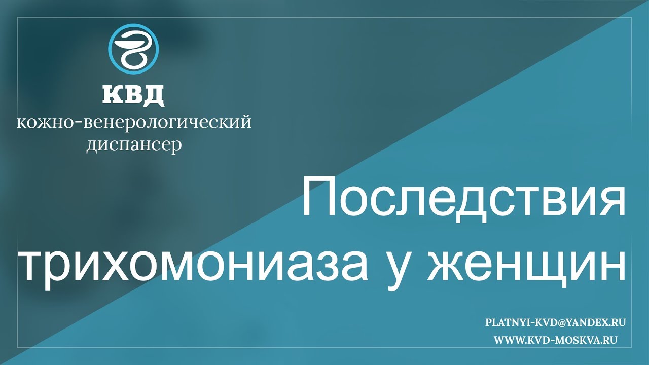 Последствия трихомониаза у женщин могут быть очень печальными, вплоть до бесплодия. на сегодня заболевание трихомониаз занимает лидирующие позиции среди венерических заболеваний. По статистике, каждый пятый житель нашей планеты хотя бы однократно на протяжении жизни инфицирован трихомониазом. Подробнее - https://kvd-moskva.ru/trikhomoniaz/145/ Для подробной консультации по этому вопросу, обращайтесь в платный центр КВД-Москва. Наши телефоны: 8 (495) 642-30-37, 8 (495) 532-66-57 Наш e-mail: platnyi-kvd@yandex.ru Наш сайт: http://kvd-moskva.ru