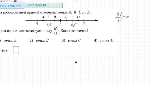 ОГЭ ФИПИ 2025 математика разбора задание 7 Тренировочная работа 5 по математике 9 класс 21 апреля 2025 года Вариант МА 2490504 (вариант 4) ОГЭ математика 2025 На координатной прямой отмечены точки A B C и D . Одна из них соответствует числу 63/11 . Какая это точка 1 точка A 2 точка B 3 точка C 4 точка D