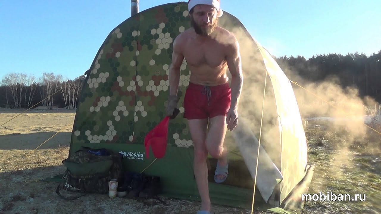 Первое испытание мобильной бани Мобиба МБ-1 (ИНИПИ) в комплекте с печью КЦ-1 (Гравицапа). Температура воздуха -3 С, морозный воздух, солнечный день, новогоднее настроение! Вода ещё не успела замёрзнуть от череды оттепелей, которые были накануне. Палатка ИНИПИ лёгкая и быстро собирается. Полок большой и малый с лёгкостью помещаются в парилку МБ-1. Мощная парогенерирующая печь КЦ-1 создаёт великолепные банные кондиции для полезнейших закаливающих мобильно-банных процедур на природе у водоёма! http://mobiban.ru/mb-1.php