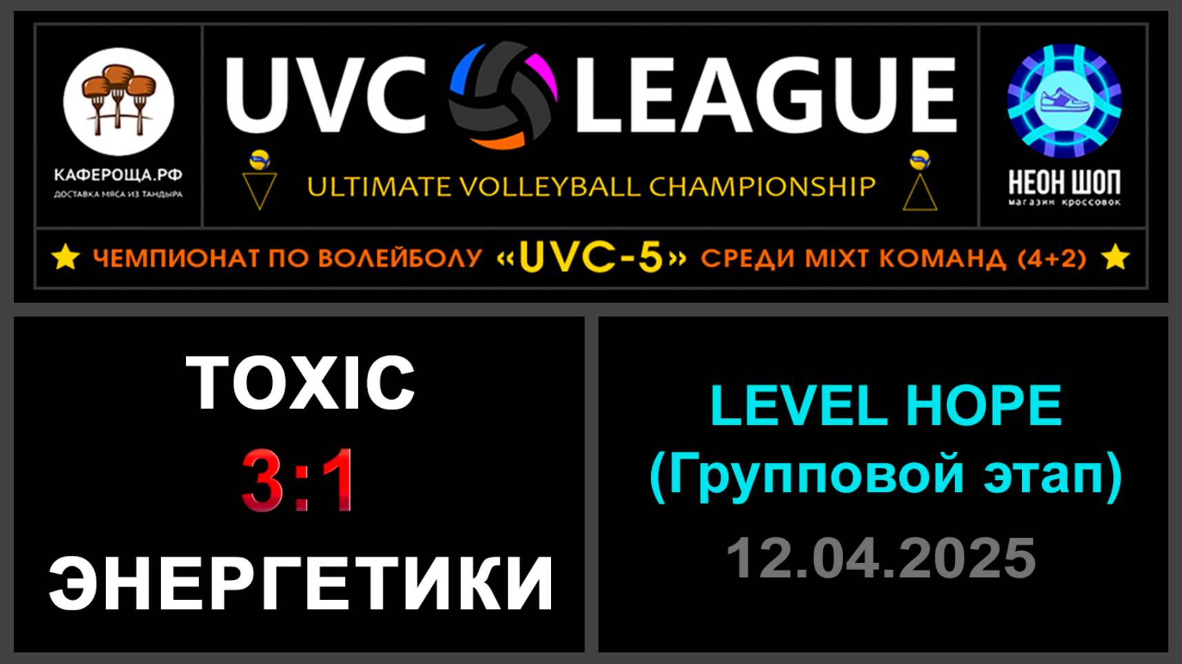 UVC-5 (Mixt): Чемпионат UVC Лиги по волейболу среди MIXT команд (4+2), 2024-2025 гг. Результаты игры: LEVEL HOPE (Групповой этап) 12.04.2025 Toxic - Энергетики 3:1 (25:23, 26:24, 19:25, 25:22) В равной борьбе Toxic одержали победу и выбили Энергетиков из борьбы за медали LEVEL HOPE! Желаем Энергетикам удачи в новых турнирах! Конкурс «Робин Гуд»: ⛔Точных попаданий не было! #UVC_ЛИГА_ЧЕМПИОНАТ_UVC_5_Mixt