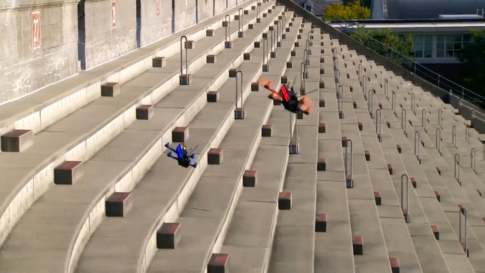 Издание Quartz опубликовало видео гонок дронов, снятое с камеры одного из них. Сама гонка прошла на стадионе во Флориде. Квадрокоптеры, которые могут разгоняться до 128 километров в час, пролетели по периметру стадиона, протискиваясь в светящиеся квадраты, а также по парковке под трибунами.
