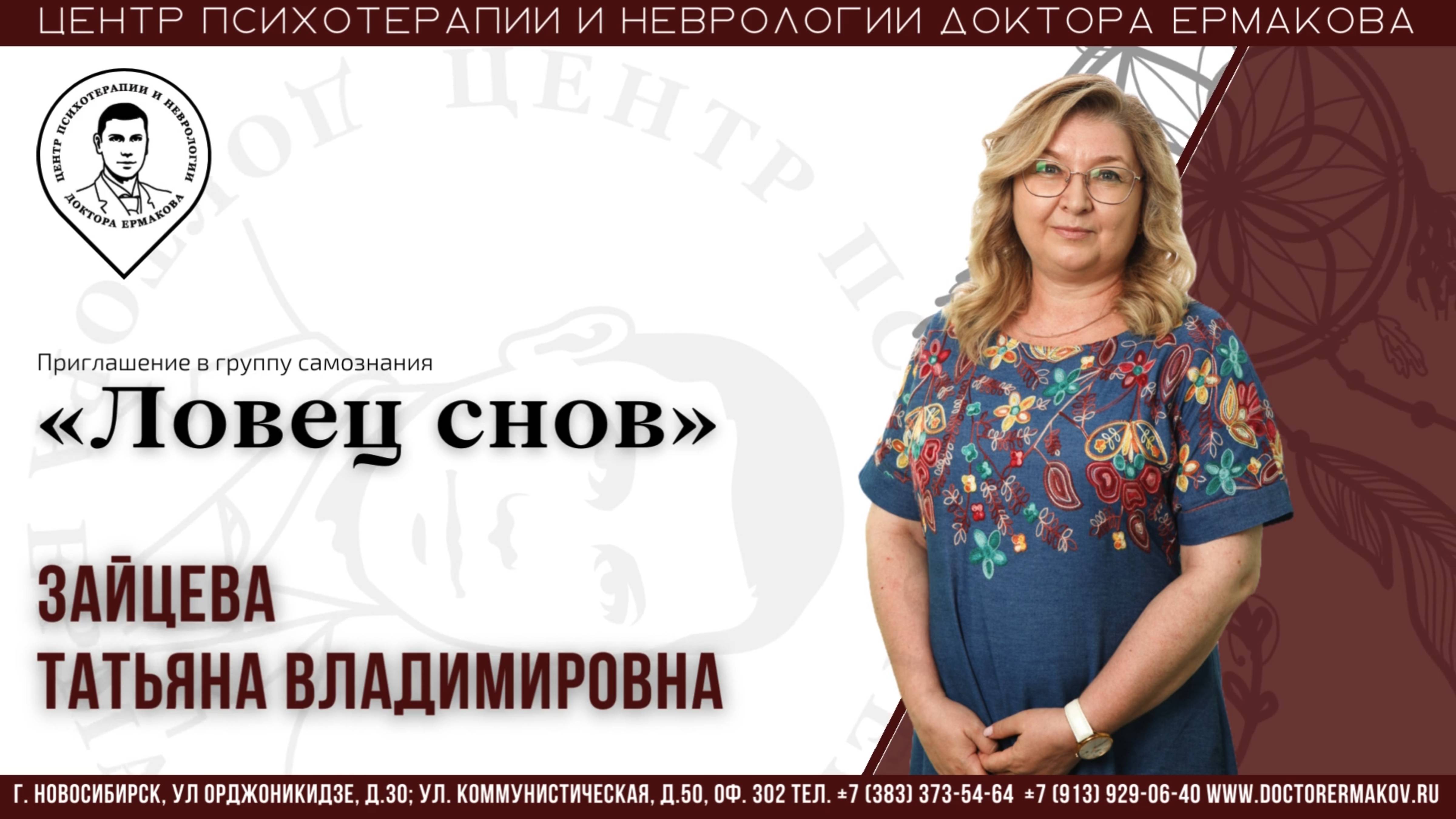 Продолжается набор в группу самопознания: «Ловец снов» Сны являются уникальным явлением нашей психической жизни. Фрейд писал, что сновидение это «королевская дорога, ведущая в бессознательное». Через расшифровку сна можно приблизиться к пониманию самых сокровенных, недоступных сознанию снов и фантазий. Групповые встречи будут посвещены обсуждению снов участников. ✅ Основные темы, на которых будет сделан акцент: В порядке очередности участники группы рассказывают свой сон. Другие участники дают свой эмоциональный отклик и задают вопросы. Затем каждый участник делится своими ассоциациями и пониманием смысла. ✅ Кому будет интересна группа? Для всех, кто хочет понимать свои скрытые желания, фантазии. ✅ Стоимость участия: Стоимость одной встречи - 2000 рублей (длительность встречи 1,5 часа), пропуски оплачиваются. ✅ Старт группы: с 21 сентября 2024 года Время проведения: суббота с 12 00 до 13:30. Формат: очно. Количество участников: 7-8 человек. Закрытая группа. Правила группы обсуждаются на собеседовании. ✅ Предварительно необходимо пройти индивидуальное собеседование с ведущей группы (длительность 30 минут). Собеседование бесплатно. ✅ Ведущая: Зайцева Татьяна Владимировна - психолог, психоаналитического направления, группаналитик. Запись по телефону: 8-913-929-06-40.