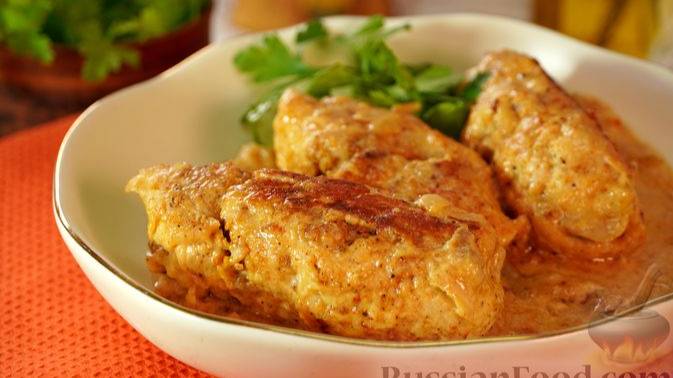 Куриные рулетики с грибами и сыром, тушенные в сливках, – сытное и ароматное блюдо чешской кухни. Куриную грудку отбивают, на неё выкладывают начинку из шампиньонов и сыра, аккуратно сворачивают и обжаривают до золотистой корочки. Затем рулетики тушат в сливках. #КуриныеРулетики #РулетикиСГРибами #РулетикиИзКурицы