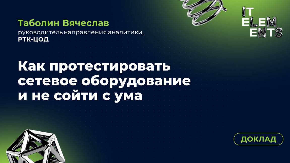 Сети — это кровеносная система любого дата-центра, и их отказ парализует все бизнес-процессы. Как выбрать надежное сетевое оборудование в условиях импортозамещения, когда рынок заполнен новыми, но «сырыми» решениями? Вячеслав Таболин, руководитель направления аналитики РТК-ЦОД, на реальном опыте рассказывает, как его компания создала R&D лабораторию и выстроила строгий процесс тестирования, который позволяет отделить работающие продукты от тех, что не готовы к промышленной эксплуатации. Из этого выступления вы узнаете, с чего начать, как формулировать требования к вендорам и каких подводных камней стоит ожидать на пути построения отказоустойчивой сетевой инфраструктуры. Вы узнаете: - Зачем создавать свою R&D лабораторию? Ответ на вызовы санкций и необходимость импортозамещения. - Системный подход к тестированию: от бизнес-требований до детальных опросников для вендоров. - Три обязательных этапа тестирования любого оборудования: от пусконаладки до проверки под нагрузкой. - Критерии качества: на что смотреть в первую очередь (управление, мониторинг, надежность, безопасность). 00:00:39 - Вопрос аудитории о практике тестирования оборудования в их компаниях. 00:01:03 - Кратко о компании РТК ЦОД, лидере на рынке дата-центров. 00:02:05 - Проблемы, с которыми столкнулись: санкции, необходимость импортозамещения и отсутствие опыта у многих компаний. 00:03:57 - Для чего была создана R&D лаборатория: проверка заявленной функциональности и работоспособности оборудования. 00:04:59 - История развития лаборатории: от стихийного сбора оборудования до полноценной инфраструктуры. 00:05:58 - Текущие масштабы: 35 стоек в двух дата-центрах и более 100 исследований за 5 лет. 00:06:49 - Клуб R&D: привлечение производителей и поиск внутренних заказчиков на решения. 00:07:39 - Почему сеть — это основа инфраструктуры. Сравнение последствий падения сервера и сети. 00:08:43 - Тестирование сетевой фабрики. Основная цель: иметь два решения по каждому инфраструктурному компоненту. 00:09:32 - Что входит в тестирование: коммутаторы, маршрутизаторы, межсетевые экраны и т.д. 00:10:05 - Ограничения в тестировании: время, занятость инженеров, новизна оборудования. 00:11:16 - Важность наличия плана тестирования. 00:11:48 - Первый шаг — аналитика: какие услуги должна предоставлять сеть и с каким качеством. 00:13:03 - Формулировка общих требований к сетевым устройствам. 00:14:05 - Использование опросников для четкой постановки задач производителям (200-300 пунктов). 00:15:31 - Важность проверки документации на соответствие реальной работе оборудования. 00:16:23 - Этап 1: Пусконаладочные работы (проверка стенда, смена прошивки, поиск backdoor). 00:16:46 - Этап 2: Базовое тестирование (проверка критических требований). 00:17:14 - Этап 3: Расширенное тестирование (проверка всей функциональности прошивки). 00:18:46 - Управление и мониторинг: out-of-band управление, массовое управление, интеграция с внешними системами. 00:20:02 - Надежность и безопасность: бездефектная работа, отсутствие backdoor, отказоустойчивость. 00:20:53 - Тестируемые топологии: EVPN, MLAG и другие. 00:21:37 - Инструменты для тестирования: T-Rex, iPerf3, ping, Wireshark и другие. 00:22:39 - Процесс внедрения протестированного оборудования: итерационно, начиная с одного проекта. 00:23:09 - Написание bug report и отслеживание исправлений. 00:23:32 - Главные уроки: идеология Zero Trust, Interop — это зло, 80% ошибок — это софт, важность аналитики. 00:24:28 - Начало се