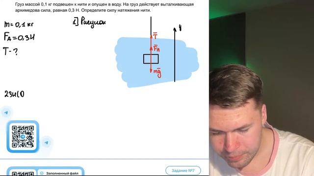 Груз массой 0,1 кг подвешен к нити и опущен в воду. На груз действует выталкивающая - №22009