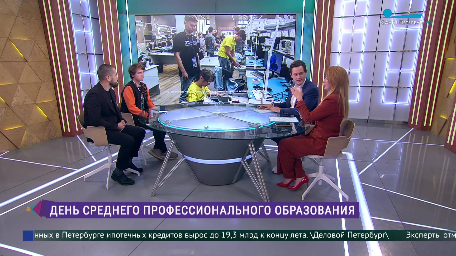 В студии программы «Утро в Петербурге» Дмитрий Чернов, мастер производственного обучения Санкт-Петербургского электромашиностроительного колледжа, и Ефим Лазаренко студент Санкт- Петербургского колледжа электроники и приборостроения, призёр Финала Чемпионата высоких технологий по компетенции «Оптоэлектроника».