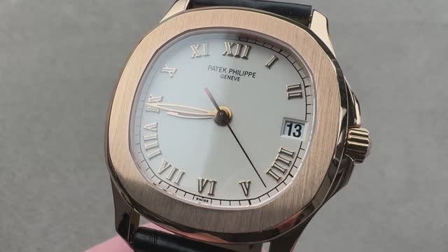 *перевести видео можно в Яндекс браузере Patek Philippe Nautilus 5060SR имеет корпус из розового золота диаметром 36 мм с белым циферблатом и черным ремешком из кожи аллигатора с застежкой из розового золота 18 карат. Функции: часы, минуты, секунды и дата. Толщина этих часов Patek Philippe составляет 8,3 мм, а расстояние между ушками — 41,6 мм.