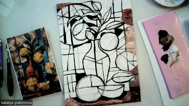 Текстурная композиция - натюрморт с апельсинами и красной вазой
