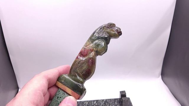 Нож из камня: Жадеит, Змеевик, Агальматолит. Клинок - Жадеит (Саяны) Рукоять - Змеевик (Хакасия) Камень между клинком ирукоятью - Агальматолит (Тыва) Подставка - Офит. 100% природные камни, без облагораживания. Вес ножа: 131 г Вес ножа с подставкой: 289 г Общая длина ножа: 21 см 3.8 см в самой широкой части Длина клинка: 11 см К605