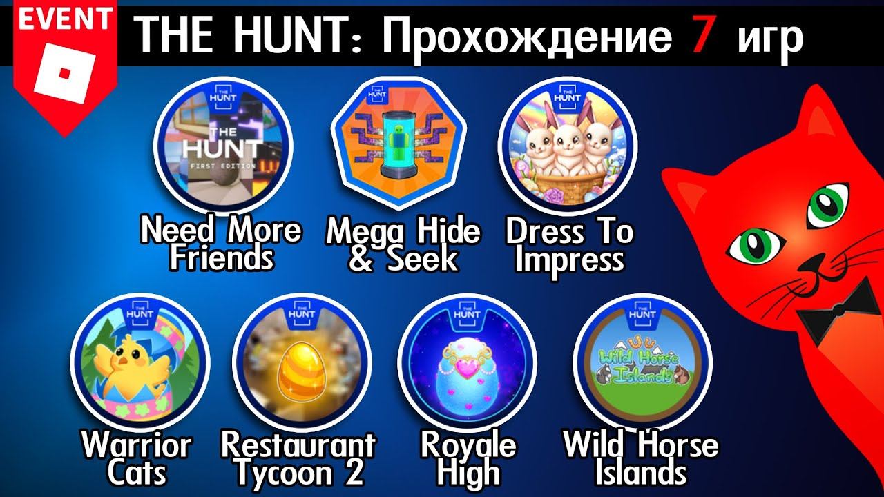 Стань крутым и получай эксклюзивные бонусы! Будь спонсором канала - https://www.youtube.com/channel/UC7jL8M3KBSO47ke9l1os_Fg/join Спасибо за Золотую кнопку YouTube (давайте соберем 3 000 000 подписчиков). Подписаться на канал (Subscribe to channel): https://www.youtube.com/channel/UC7jL8M3KBSO47ke9l1os_Fg?sub_confirmation=1 #роблокс, #roblox, #redcat Сегодня я покажу как получить БЕЙДЖ 43-49 в ивенте ОХОТА 2024 роблокс (The Hunt 2024 roblox). Прохожу игры: NEED MORE FRIENDS, Mega Hide and Seek, Dress To Impress, Foal Hub Wild Horse Islands, Royale High, Restaurant Tycoon 2, Warrior Cats Ultimate Edition. Ивент - https://www.roblox.com/the-hunt Игра 1 - https://www.roblox.com/games/16445368294/HUNT-NEED-MORE-FRIENDS Игра 2 - https://www.roblox.com/games/5708035517/HUNT-Mega-Hide-and-Seek Игра 3 - https://www.roblox.com/games/15101393044/Dress-To-Impress Игра 4 - https://www.roblox.com/games/6989310863/Foal-Hub-Wild-Horse-Islands Игра 5 - https://www.roblox.com/games/735030788/Royale-High-The-Hunt Игра 6 - https://www.roblox.com/games/3398014311/Restaurant-Tycoon-2 Игра 7 - https://www.roblox.com/games/3663340706/Warrior-Cats-Ultimate-Edition ------------------------------------------------------- Второй канал (RED CAT GAMES) - https://www.youtube.com/channel/UCExXag432rjhB4pbLgVMD0A?sub_confirmation=1 Третий канал (Red Cat WOW) - https://www.youtube.com/@RedCatWOW Телеграм канал - t.me/redcat_official (@redcat_official) Cтраница канала в Инстаграме - https://www.instagram.com/redcatyoutube Сервер в DISCORD - https://discord.com/invite/redcatyoutube (redcatyoutube) Поддержать канал донатом: Все страны - https://donatepay.ru/don/redcat Украина - https://red-cat.diaka.ua/donate Мой профиль в РОБЛОКС (ник ORedCat) - https://www.roblox.com/users/531556867/profile Мой СЕРВЕР и МЕРЧ в Роблокс - https://www.roblox.com/groups/4046965/Red-Cat-Channel#!/store Моя игрушка в Роблокс (Красный кот) - https://www.roblox.com/catalog/13175970108/Red-Cat-Pal ------------------------------------------------------- Смотрите еще много всего интересного на канале Red Cat. Надеюсь вам понравится и вы останетесь. Не ходите по другим каналам, тут вас любят! Мяу