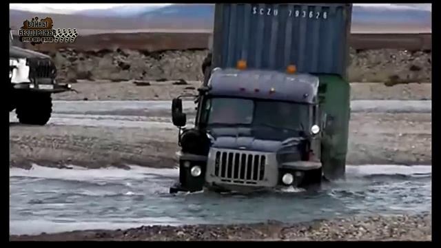 Гружёный с прицепом грузовик Урал проезжает через реку