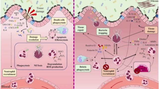 Нейтрофилы являются наиболее многочисленными иммунными клетками в кровообращении человека и быстро направляются к местам инфекции или воспаления, образуя первую линию иммунной защиты. При повреждении кишечного барьера нейтрофилы из кровообращения попадают в воспаленную ткань через множество хемотаксических градиентов, образованных цитокинами, такими как: ИЛ-1β, ИЛ-6 и фактором некроза опухоли (ФНО)-α; хемокинами, такими как CCL8, лигандом хемокина (мотив CXC) (CXCL)10 и макрофагальным воспалительным белком 2 (MIP)-2 (также известным как CXCL2); и факторами роста, такими как гранулоцитарно-макрофагальный колониестимулирующий фактор (ГМ-КСФ) и гранулоцитарный колониестимулирующий фактор (Г-КСФ). Привлечение нейтрофилов также опосредуется молекулами бактериального происхождения, такими как формил-метионил-лейцил-фенилаланин и короткоцепочечные жирные кислоты (SCFA). В здоровом кишечнике (слева) повреждение кишечного барьера запускает привлечение нейтрофилов из кровотока в воспаленную ткань по хемотаксическому градиенту, образованному цитокинами (IL-1β, IL-6, TNF-α), хемокинами (CCL8, CXCL10, MIP-2) и факторами роста (GM-CSF, G-CSF). Привлечение нейтрофилов также опосредовано молекулами бактериального происхождения, такими как формилметиониллейцилфенилаланин (fMLP) и короткоцепочечные жирные кислоты (SCFA). Привлеченные нейтрофилы участвуют в элиминации микроорганизмов посредством фагоцитоза, дегрануляции, генерации активных форм кислорода (ROS) и высвобождения нейтрофильных внеклеточных ловушек (NET). После завершения своих функций нейтрофилы подвергаются апоптозу и эффероцитозу, способствуя разрешению воспаления, восстановлению тканей и возвращению к нормальному гомеостазу тканей. Участие нейтрофилов и НЭТ при ВЗК — палка о двух концах (справа). Нейтрофилы сотрудничают в заживлении ран и разрешении воспаления, высвобождая факторы роста эндотелия сосудов (VEGF) и липидные медиаторы (протектин D1, резолвин E1). Эти факторы препятствуют привлечению нейтрофилов и способствуют фагоцитозу. НЭТ препятствуют распространению микроорганизмов, захватывая их в среду микробицидных компонентов, и стимулируют заживление слизистой оболочки кишечника. Нейтрофилы напрямую вызывают повреждение тканей, высвобождая нейтрофильную эластазу, протеазы (ММП), провоспалительные цитокины (ИЛ-8, ФНО-α, ИЛ-1β), лейкотриен B4 и ROS. Эти факторы провоцируют не только повреждение эпителиального барьера, но и привлечение нейтрофилов и других иммунных клеток к воспаленной ткани. Привлечение нейтрофилов также стимулируется цитокинами ИЛ-1α, ИЛ-17, ИЛ-22, Г-КСФ и ГМ-КСФ. Отсутствие у нейтрофилов протективного гена CARD9, отвечающего за развитие ВЗК, усиливает продукцию активных форм кислорода (ROS). ИЛ-8, ФНО-α и PAD4 (уровень которых повышен у пациентов с язвенным колитом) способствуют образованию НЭТ. Накопление НЭТ в толстой кишке сопровождается повреждением тканей и воспалением, поскольку НЭТ также усиливают продукцию ФНО-α и ИЛ-1β. Источник Патофизиология воспалительных заболеваний кишечника: врожденная иммунная система к Анжела Саез,Беатрис Эрреро-Фернандес, Ракель Гомес-Брис, Гектор Санчес-Мартинес и Хосе М. Гонсалес-Гранадо 1 Лаборатория LamImSys, Санитарная больница Института исследований, 12 октября (imas12), 28041 Мадрид, Испания 2 Факультет научных исследований, Университет Франсиско де В итория 