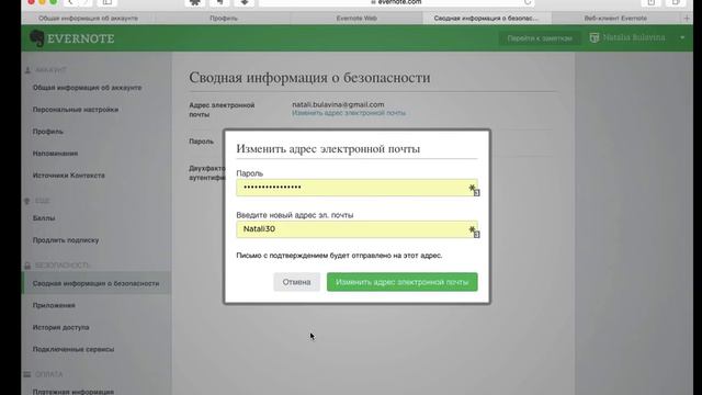 Смена адреса электронной почты в Evernote