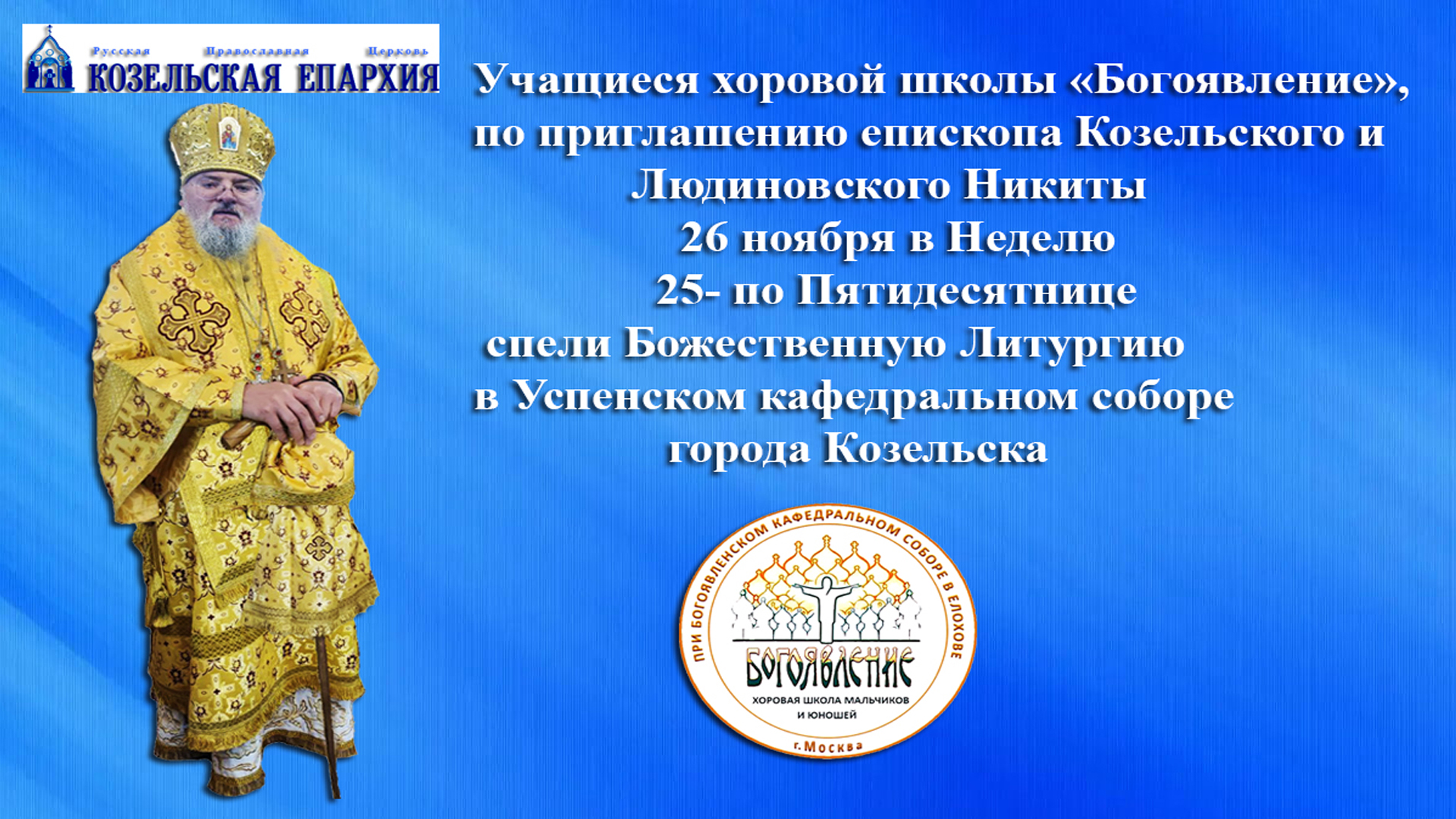 26 ноября 2023 г. по благословению настоятеля Богоявленского кафедрального собора г. Москвы архиепископа Одинцовского и Красногорского Фомы учащиеся Хоровой школы мальчиков и юношей "БОГОЯВЛЕНИЕ" и по приглашению епископа Козельского и Людиновского Никиты пели на Божественной Литургии в Успенском кафедральном соборе города Козельска.