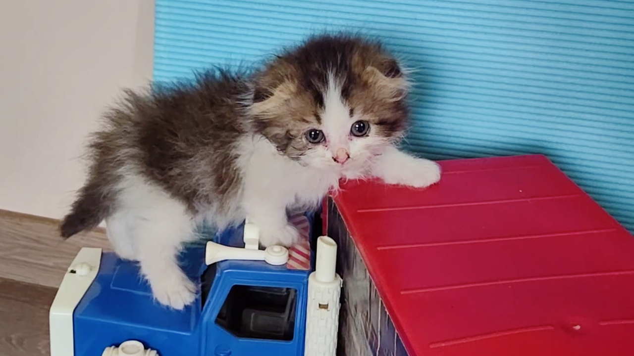 Маленький котёнок играет с детским грузовиком.Часть 1.