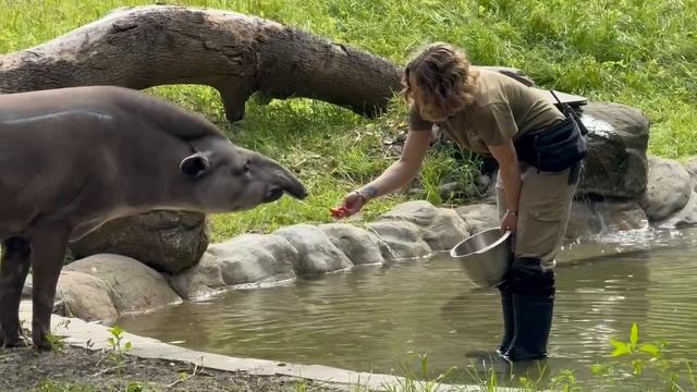Даааа, не на такую летнюю погоду мы рассчитывали, когда строили новый бассейн для тапира😏 Но вот водоём готов, вода чиста и свежа, не хватает в нём самого главного — собственно тапира. А Вик — не глуп: явно смекает, что погода не для купания. И как уж ни старается Анжелика, как ни приманивает его сочной морковочкой, он даже копыта мочить не собирается. Сами вашу морковочку кушайте и купайтесь тоже сами, а нам и на травке неплохо😊 Мы не можем осуждать Вика, более того, мы бы в воду сейчас за морковочку тоже не полезли. Подождём ка погоды потеплее, ну должна же она случиться этим летом!