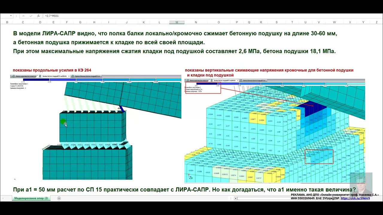 Переподготовка «ПГС: проектирование ЗиС (расчетно-конструктивный раздел)». Ссылка на страницу переподготовки https://makeev.justclick.ru/1pgs . Представлен краткий обзор (Видео 6.4) результатов расчетов НДС в кирпичной кладке под бетонной подушкой в опоре стальной балки на кирпичную стену по СП 15 и в ЛИРА-САПР с учетом совместной работы конструкций в створе КР по МК «Проектирование и расчет балочной клетки». Ссылка на ролик географии слушателей переподготовки https://youtu.be/o9JaBrjMTPw?si=Dk-zrdte2wGoAIl9 . Ссылка на ролик обзора образовательного портала Онлайн университета https://youtu.be/ZBewPiXsEss?si=CgcyWxYMp2JFW9KR . Ссылка на ролик «Обзор решение 3х задач ГХС стержней» https://youtu.be/yyQIvLi1gWE?si=S0so1AL9rMi8Z2zR. Ссылка на 30 роликов по темам переподготовки https://www.youtube.com/playlist?list=PLRg82kZ234fIcSxOKejYaWodGH6naPgSP. РЕКЛАМА. АНО ДПО «Онлайн университет проф. Макеева С.А.» ИНН 5503269649. Erid: 2VtzqwjjZ6P. https://clck.ru/39kHr9. Оформить подписку на все бесплатные видео материалы проф. Макеева С.А. можно на главной странице https://sopromex.ru/ либо на специальной странице https://makeev.justclick.ru/podpiska_2020 . В течение месяца каждый день вам на почту будут приходить структурированные видео материалы по основам расчетов конструкций на прочность и жесткость (не забыть подтвердить подписку на почте). Все платные тренинги проф. Макеева С.А. по основам расчетов конструкций на прочность и жёсткость (это 25 качественных видео материалов и авторских ПК) смотреть по ссылке https://disk.yandex.ru/i/xgHKw4irLRXe1A.