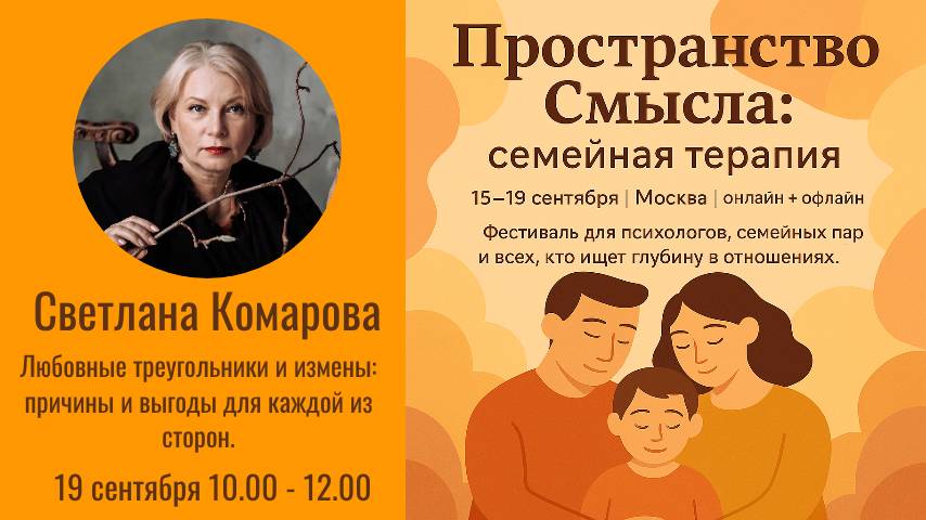 Светлана Комарова "Любовные треугольники и измены: причины и выгоды для каждой из сторон" Выступление Светланы Комаровой на фестивале "Пространство Смысла: семейная терапия" 19 сентября 2025 года. Светлана Комарова - бизнес-тренер, психотерапевт, расстановщик. Писатель, автор бестселлера "Бизнес-ведьмы". Консультант топ-менеджеров компаний списка Форбс-200. Победитель и призер всероссийских конкурсов в сфере HR. Преподаватель Школы карьерного менеджмента. Сайт: svetlanakomarova.ru/ ТГ: t.me/SvetlanaKo... "Пространство Смысла" - это цикл фестивалей авторских подходов в психологии, терапии и коучинге, посвященных разным темам, а также онлайн-библиотека курсов по психологии от мастеров фестиваля. Сайт: www.prostranstvo-smysla.ru/ ТГ: www.prostranstvo-smysla.ru/