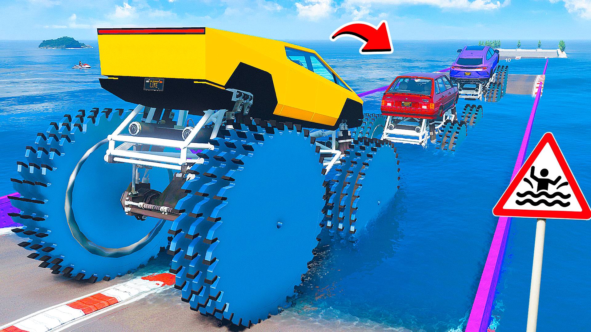 СМОГУТ ЛИ ГИГАНТСКИЕ МАШИНЫ НА ПИЛАХ ПРОЕХАТЬ ГЛУБОКУЮ ЯМУ С ВОДОЙ В ГТА 5 МОДЫ - ЭКСПЕРИМЕНТЫ GTA 5