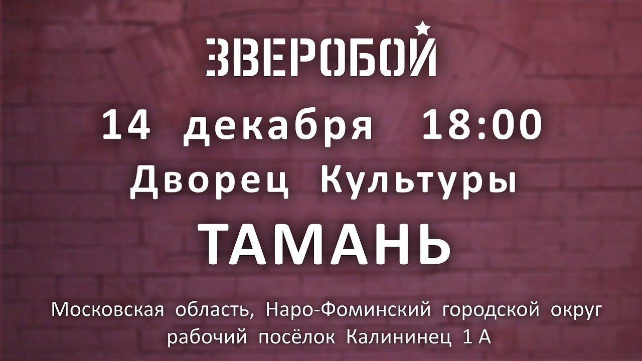 Купить билет: https://iframeab-pre3794.intickets.ru/node/11295869 Адрес: Московская область, Наро-Фоминский р-н, рабочий поселок Калининец, ДКИС "Тамань". Начало 18:00. Наряду с полюбившимися хитами, ЗВЕРОБОЙ представит свою новую программу под названием "Ты будешь жить!" Приобретайте билеты через электронный онлайн-сервис на сайте группы zveroboi.ru, либо в кассах ДКИС "Тамань"!