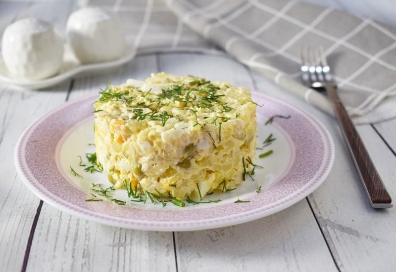 Куриное филе 300 гр Картошка 3 шт. Яйца 3 шт. Морковь 1 шт. Маринованные огурцы 4 шт. Зелёный горошек 150 гр Майонез 100 гр