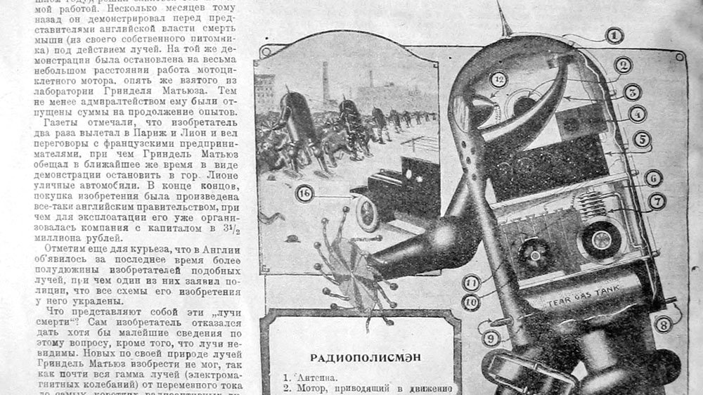 1924: Приводимый ниже рисунок, не плод свободной фантазии. При современных достижениях телемеханики (управления механизмами на расстоянии помощью радио) осуществление такого телемеханического автомата находится в пределах возможности. У кого что болит: американский журнал, у которого заимствован этот рисунок, не нашел лучшего применения для телемеханики, как приспособить ее для борьбы с "чернью" и "для нужд промышленности" (против рабочих волнений.). Такой механический полисмэн, действительно, неуязвим. Его плоть - сталь, нервы - радиоволны, а мозг и воля - сосредоточены в автомобиле, в котором сидят люди, управляющие издали помощью радио всеми манипуляциями стального полисмэна. Радио только управляет, но не передает той энергии, которая необходима для движения того или иного механизма. Эту энергию дает бензиновый мотор, приводящий во вращение динамо-машину. Ее током питается прожектор, освещающий толпу, и ряд вспомогательных моторов. Одни из них приводят в движение руки чудовища, снабженные вращающимися дисками. Свинцовые шарики, прикрепленные к дискам на гибких лентах, действуют в качестве колотушек. При передвижении этот полисмэн не шагает, а катится на своих ступнях, снабженных подобно трактору гусеничными лентами. Быстро вращающиеся жироскопы придают устойчивость всему аппарату. Зычный голос, раздающийся из громкоговорителя, служит, для устрашения и увещевания толпы, или для отдачи ей приказаний, передаваемых по радиотелефону из автомобиля. Наконец, чудовище снабжено еще баком со слезоточивым газом. Для приема волн служит антенна, прикрепленная к шлему и спине железного полисмэна. Подписывайтесь на РУТУБ-канал, развивайте "наш интернет". Смотрите описание этого канала. Эксклюзив части видео https://www.youtube.com/@Skif Донатим, за труд над видео. Неблагодарность карается Космосом.