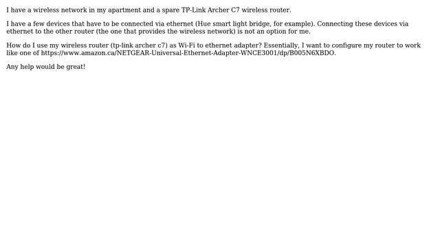 How to use wireless router (tp-link archer c7) as Wi-Fi to ethernet adapter? Helpful? Please support me on Patreon: https://www.patreon.com/roelvandepaar With thanks & praise to God, and with thanks to the many people who have made this project possible! | Content (except music & images) licensed under CC BY-SA https://meta.stackexchange.com/help/licensing | Music: https://www.bensound.com/licensing | Images: https://stocksnap.io/license & others | With thanks to user user797632 (superuser.com/users/797632), user dirkt (superuser.com/users/327880), and the Stack Exchange Network (superuser.com/questions/1262896). Trademarks are property of their respective owners. Disclaimer: All information is provided "AS IS" without warranty of any kind. You are responsible for your own actions. Please contact me if anything is amiss at Roel D.OT VandePaar A.T gmail.com