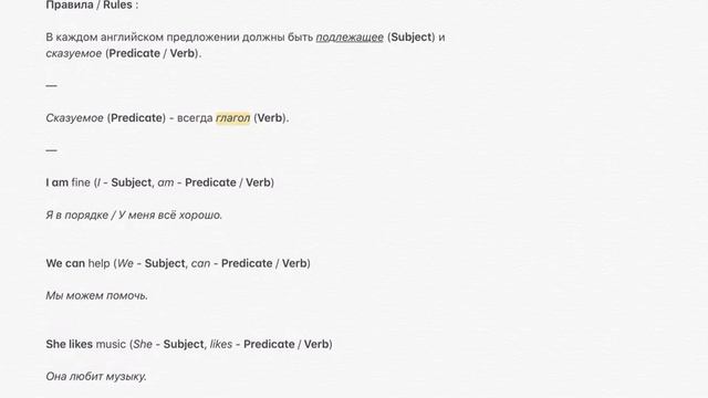 В каждом предложении - подлежащее (Subject) и сказуемое (Predicate / Verb)