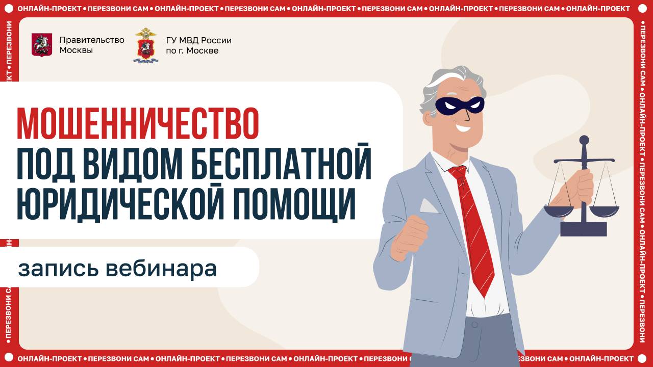 Как распознать мошенников, предлагающих "бесплатную" юридическую помощь? Телефонные мошенники постоянно придумывают новые схемы обмана, и одна из них — фиктивные юридические консультации. Как понять, что перед вами мошенник, и куда действительно можно обратиться за бесплатной юридической помощью? Эти вопросы разобрали на вебинаре “Мошенничество под видом бесплатной юридической помощи”. Спикеры: Эксперты Департамента информационных технологий Москвы Представители ГУ МВД России по городу Москве Юристы, специализирующиеся на защите прав граждан Что обсудили: • как распознать мошенника, который предлагает бесплатную юридическую помощь; • по каким признакам можно выявить мошенничество под видом бесплатной юридической помощи; • куда обращаться, чтобы получить бесплатную юридическую консультацию. Смотрите запись вебинара и поделитесь с близкими! Будьте внимательны и не дайте себя обмануть. Хотите посетить следующий вебинар очно? Регистрируйтесь заранее на сайте “Перезвони сам” в разделе “Предстоящие вебинары”. https://sam.mos.ru/