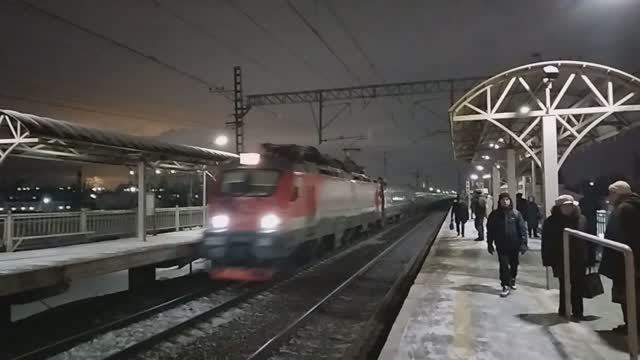 Фирменный поезд "Таврия" № 8 сообщением Севастополь — Санкт-Петербург с электровозом ЭП20-019 проследует станцию Санкт-Петербург-Сортировочный-Московский по II пути, на I путь прибывает пригородный электропоезд ЭТ2М-058. Снято 10.02.2024 года. #ржд #поезда #поезд_таврия #эп20 #электровоз #электричка #эт2м #санктпетербург #поездароссии