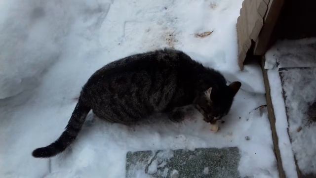 Кот радуется что его кормят