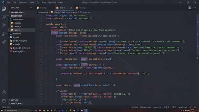 Code your own Discord music bot! Music bots are one of the most fun discord bots to code and maintain! In this video, we use all new discord js v12 code to create an amazing discord music bot with join and leave commands. We use keyword research to search for the best youtube video and play the sound. Following this tutorial, we will create a second video going over queues and skips. Make sure to subscribe for more content! Terminal NPM install command: npm install @discordjs/opus ffmpeg-static yt-search ytdl-core ? Discord Server: https://discord.gg/arJ92B5YNH ? Twitch Channel: https://www.twitch.tv/itzalesh ? Second Chanel: https://www.youtube.com/aleshgames ? Code In Video: https://pastebin.com/dkbdFccP ? FFMPEG: https://www.youtube.com/watch?v=r1AtmY-RMyQ&t=34s ? Playlist: https://www.youtube.com/playlist?list=PLbbLC0BLaGjpyzN1rg-gK4dUqbn8eJQq4 ? Twitter: https://twitter.com/itzalesh NodeJS: https://nodejs.org/en/ Visual Studio Code: https://code.visualstudio.com/ Discord Developer Portal: https://discordapp.com/developers/ Permissions Calculator: https://discordapi.com/permissions.html