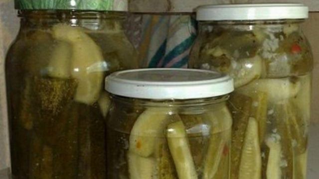 Ингредиенты: 4 кг. огурцов порезать вдоль и залить все: -1 стак. сахара -1 стак. подсолнечн. масла рафиниров. -1 стак. уксуса 9% -100гр. соли -1 ст.л. молотого черного перца -2 ст.л. чеснока выдавленного Пусть все постоит 1,5 часа ( в течении этого времени несколько раз перемешать) Затем в стерильные банки. Плотно сложить огурцы (как бы их поставить) с маринадом, простерилизовать - 0,5 л банк и -15 мин. и закатать.