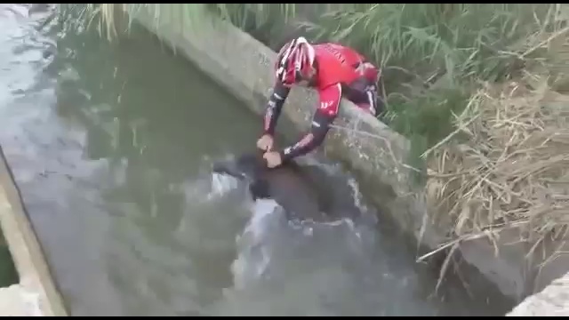 Дикий кабан не мог выбраться самостоятельно из канала, проезжающие мимо велосипедисты помогли ему.