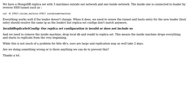 MongoDB Reverse SSH Replica Set Config Fails when leader changes Helpful? Please support me on Patreon: https://www.patreon.com/roelvandepaar With thanks & praise to God, and with thanks to the many people who have made this project possible! | Content (except music & images) licensed under CC BY-SA https://meta.stackexchange.com/help/licensing | Music: https://www.bensound.com/licensing | Images: https://stocksnap.io/license & others | With thanks to user Mustafa Yilmaz (dba.stackexchange.com/users/145152), user JJussi (dba.stackexchange.com/users/121114), and the Stack Exchange Network (dba.stackexchange.com/questions/198365). Trademarks are property of their respective owners. Disclaimer: All information is provided "AS IS" without warranty of any kind. You are responsible for your own actions. Please contact me if anything is amiss at Roel D.OT VandePaar A.T gmail.com