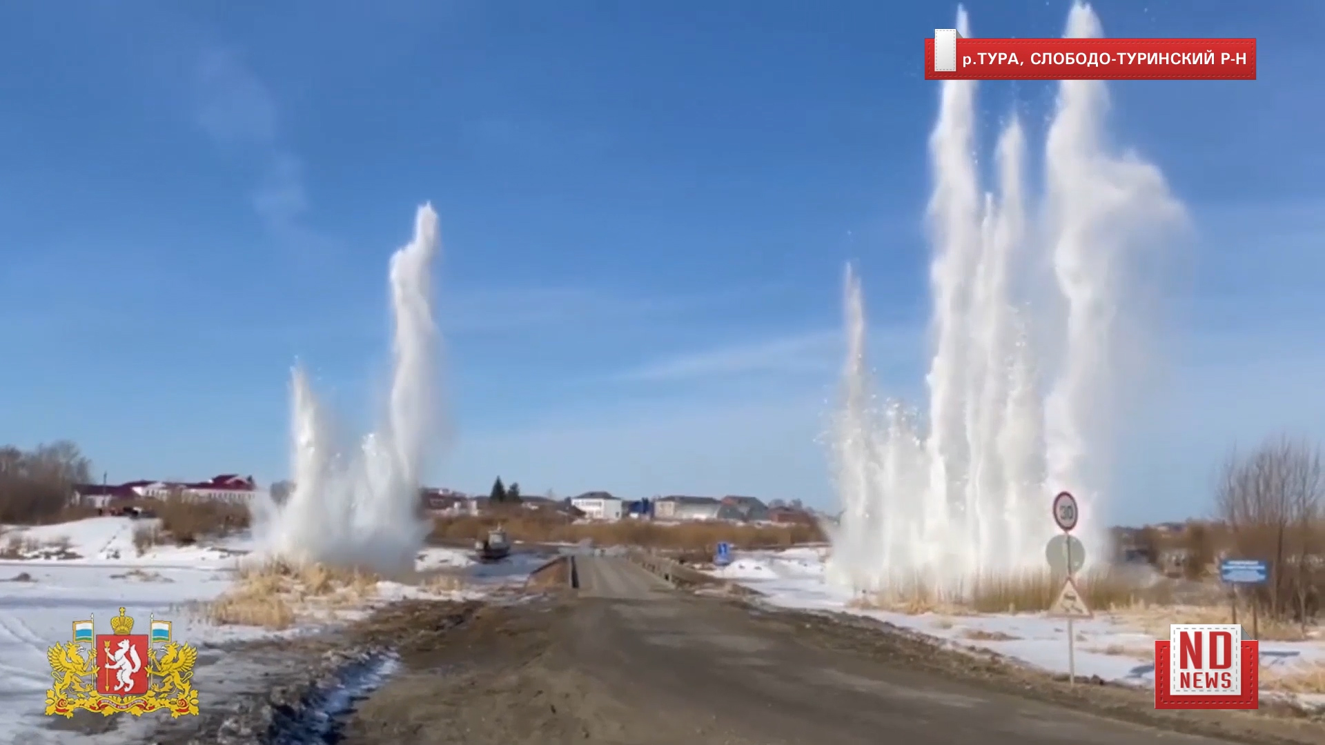 31 марта 2021 года. В Свердловской области специалисты начали взрывать лед на северных реках. Его убирают рядом с мостами, чтобы он не застревал между опорами и не препятствовал проходу воды во время паводка. На реке Туре в Слободо-Туринском районе лед уже взорвали. Подробнее – https://newdaynews.ru/ekaterinburg/720272.html