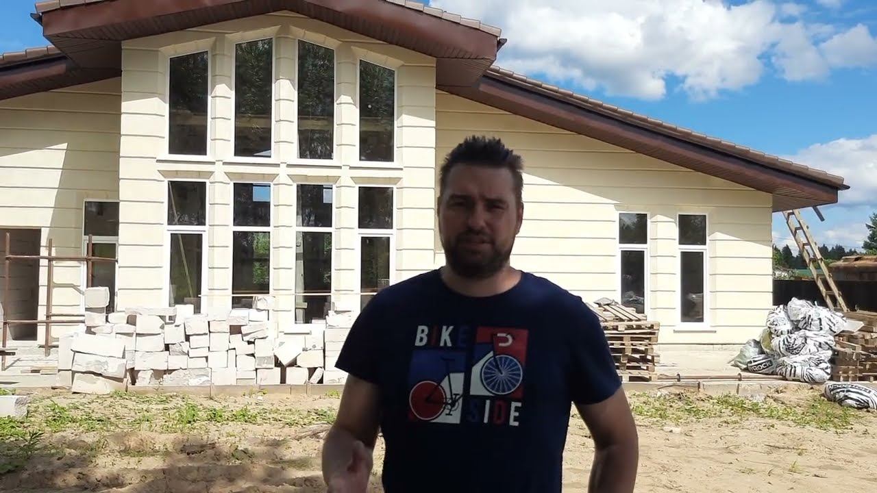 Большой одноэтажный дом из газобетона с вторым светом и кровлей из цементно-песчаной черепицы Браас на ЖБ плите. Истринский район Мособласти. Проект дома №119
