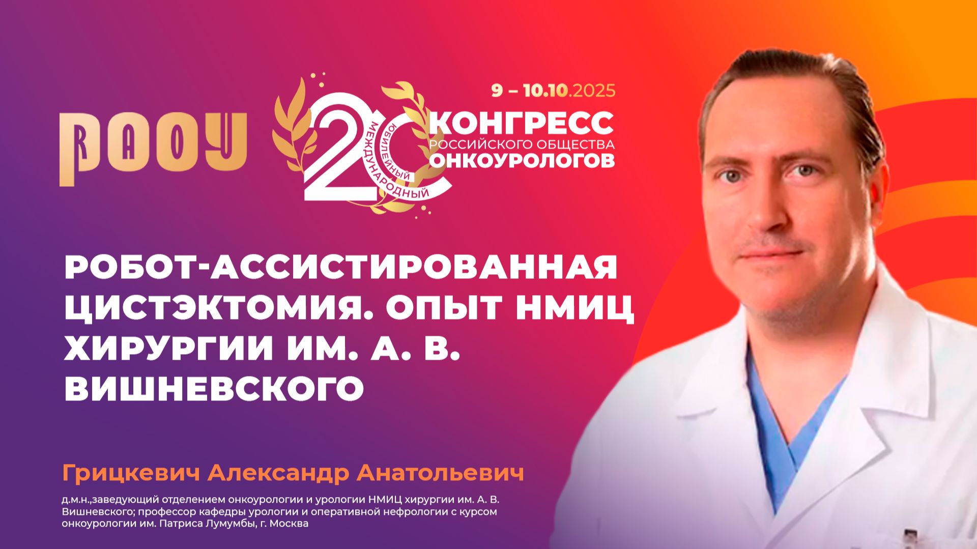 10 октября на XX Международном Конгрессе РООУ Грицкевич Александр Анатольевич представил доклад на тему: "Робот-ассистированная цистэктомия. Опыт НМИЦ хирургии им. А. В. Вишневского". ✅ Эксперт: Грицкевич Александр Анатольевич, д.м.н.,заведующий отделением онкоурологии и урологии НМИЦ хирургии им. А. В. Вишневского; профессор кафедры урологии и оперативной нефрологии с курсом онкоурологии им. Патриса Лумумбы, г. Москва. ➡️ Официальный сайт РООУ: https://roou.ru/ Присоединяйтесь к нам в социальных сетях. Делитесь мнением и повышайте уровень теоретической и практической подготовки в онкоурологии: Telegram: https://t.me/oncologyurology ВКонтакте: https://vk.com/oncologyurology #РООУ #RAOU #ОбществоОнкоурологов #Онкоурология #Урология #Онкология #Oncourology #XXКонгрессРООУ #КонгрессРООУ #ракпочки #медицинскиеконференции #urology