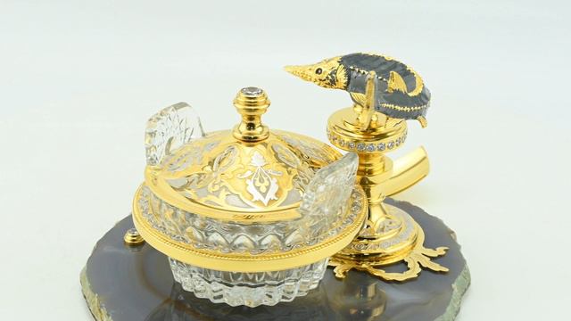 •Материал: натуральный камень агат, фианит, хрусталь, латунь, никель 9мкм, золото 5мкм. •Размер: икорница 200*180*125мм, ложка 130*22мм •Техника исполнения: художественное литьё, токарные работы, слесарные работы, травление, гравирование, ручная подрезка, рисование кистью, никелирование, золочение, чернение, ювелирные работы, камнерезные работы. •Упаковка: подарочная коробка из дерева с ложементом. Цена: 38 400 руб. https://radugakamnya.ru/catalog/suveniry_iz_kamnya/zlatoustovskaya_gravyura/ikornitsa_s_kamnem_agat_osetr_zlatoust-509575/