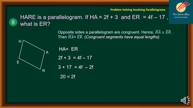 In this math tutorial video, we will discuss Problem Solving Involving Parallelograms: Grade 9 Quarter 3. Also, you will learn the conditions that satisfy that a quadrilateral is a parallelogram. Also, you will be able to determine the properties of a parallelogram and properties of diagonals on special quadrilaterals and use these to find measures of angles, sides, and other quantities involving parallelograms. In addition to this, we will tackle the properties of the diagonals of special quadrilaterals. Furthermore, we will discuss and solve word problems involving parallelograms. 1. Quadrilateral MILK is a parallelogram. If "m∠K = 120" what is "m∠I"? 2. CONE is a parallelogram. If m"∠"O = a + 15 and m"∠"E = 40, what is a? 3. MALT is a parallelogram. If m"∠"M = 2b +10 and m"∠"L = b + 30 , what is m"∠L"? 4. PHIL is a parallelogram. If m"∠"L = 70 what is m"∠"P? 5. MAZE is a parallelogram. If m"∠"M= c – 60 and m"∠"E = 2c, what is m"∠E"? 6. TASK is a parallelogram. If m"∠"T = 2d and m"∠"S = 4d - 80, what is m"∠K"? 7. MASK is a parallelogram. If AM = 3e and SK = 60, what is the value of e? 8. HARE is a parallelogram. If HA = 2f + 3 and ER = 4f – 17 , what is ER? 9. GATE is a parallelogram. If EA = 28 inch, what is the length of (𝐸𝑆) ̅. 10. GATE is a parallelogram. If EA = 28 inch, what is the length of (𝐸𝑆) ̅. 11. FACE is a rectangle. If the diagonal FC = 3x and diagonal EA is 24 cm, find the value of x. 12. FRIE is a square. Find the m∠REI. 13. □ EDSA is a square. If m∠ESD is 3(x +7), what is x? 14. LACE is a rhombus.. If m ∠LCA = 40, what is the m∠CLE? 15. FRES is a rhombus. If m∠RSE = 27, what is m∠FES? 16. □ FRES is a rhombus. If SH = 5x – 1 cm and HR = 29, what is the value of x?