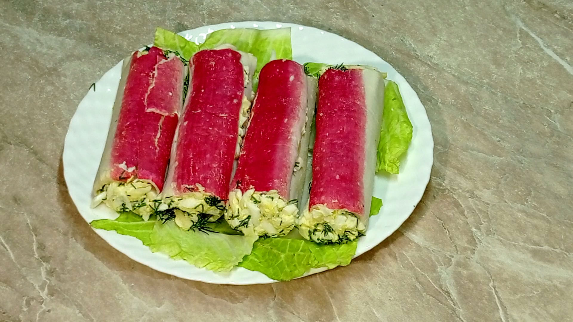 Эффектные роллы из крабовых палочек рецепты, рецепты простые, рецепты быстрые Простая и бюджетная закуска на праздничный стол. Это хороший способ разнообразить закуски с крабовыми палочками. Ингредиенты: яйца — 2 шт. сыр — 75 гр. укроп 3 веточки чеснок — 1 зубчик майонез 3ст.л. крабовые палочки — 5 шт соль по вкусу Приготовление: Отвариваем вкрутую яйца, очищаем и остужаем. Натираем на мелкой терке желтки, на крупной терке измельчаем белки. Натираем сыр. Режем укроп, смешиваем с желтками, белками и сыром. Натираем на мелких резцах терки, чеснок, заправляем майонезом. Крабовые палочки разворачиваются в пластины. Поверхность палочек смазываем начинкой, заворачиваем обратно в рулеты. Смазываем торцы рулетов майонезом и окунаем в остатки начинки.