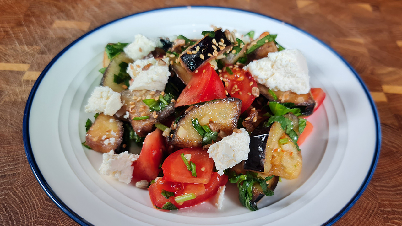 Салат с хрустящими баклажанами – это интересный и очень вкусный салат, который в разных его интерпретациях можно встретить во многих кухнях мира. Основной фишкой этого салата являются баклажаны, обжаренные во фритюре. При таком способе приготовления они становятся хрустящие снаружи и нежные внутри. Это очень вкусно! Ещё отмечу, что хрустящая корочка у баклажанов охотно впитывает все добавленные в салат соусы и делает их ещё вкуснее! В данном рецепте я приготовил азиатскую вариацию салата с хрустящими баклажанами, добавив к ним кисло сладкий соус. Попробуйте повторить, и вы не пожалеете! Приятного аппетита! === Для рецепта Вам понадобится === Баклажан – 1шт; Помидоры – 2шт; Чеснок – 2зуб; Твороженный сыр – 50гр; Мята; Базилик; Кинза; Оливковое масло – 2ст.л; Кунжутное масло – 1 ст.; Семена подсолнечника – 5гр; Кукурузный крахмал; Растительное масло – 0.5л; Соль;