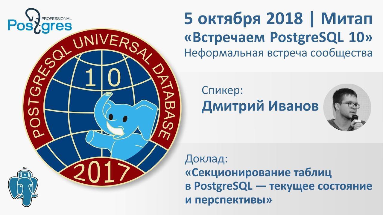 Митап «Встречаем PostgreSQL 10» Дмитрий Иванов «Секционирование таблиц в PostgreSQL — текущее состояние и перспективы» 5 октября 2017 20171005