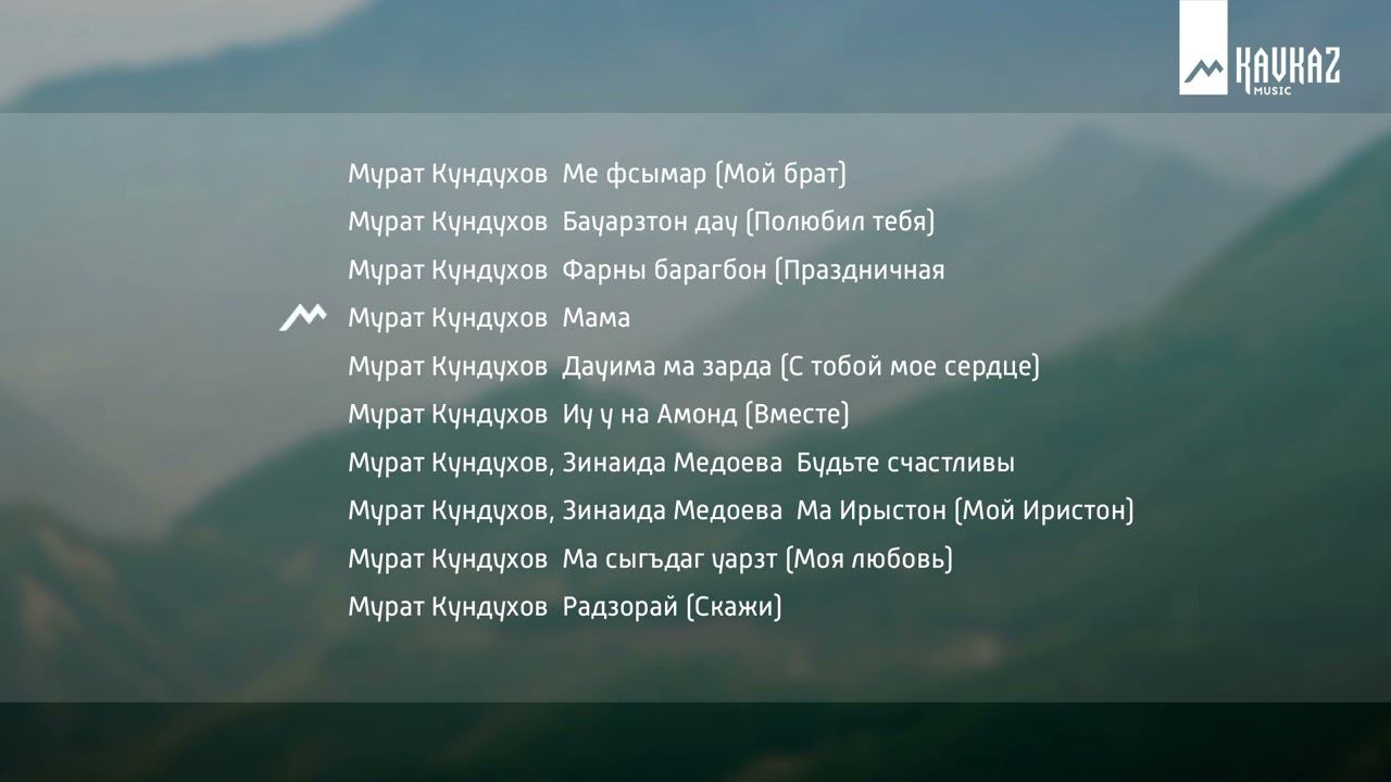 Мурат Кундухов - Зардайы залта Ме фсымар (Мой брат) Музыка: Мурат Кундухов Слова: Ирма Кумаритова Бауарзтон дау (Полюбил тебя) Музыка: Людмила Хекилаева Слова: Людмила Хекилаева Фарны барагбон (Праздничная Музыка: Людмила Хекилаева Слова: Мурат Кундухов Мама Музыка: Наира Гикаева Слова: Мурат Кундухов Дауима ма зарда (С тобой мое сердце) Музыка: Людмила Хекилаева Слова: Анета Гацоева Иу у на Амонд (Вместе) Музыка: Людмила Хекилаева Слова: Мурат Кундухов Будьте счастливы Музыка: Мурат Кундухов Слова: Анета Гацоела Ма Ирыстон (Мой Иристон) Музыка: Мурат Кундухов Слова: Мурат Кундухов Ма сыгъдаг уарзт (Моя любовь) Музыка: Леонид Тибилов Слова: Мурат Кундухов Радзорай (Скажи) Музыка: Мурат Кундухов Слова: Ирина Хидирова KAVKAZ MUSIC объединяет и транслирует этническую музыку народов Кавказа. Подписывайся: YouTube: https://youtube.com/kavkazmusictv ВКонтакте: https://vk.com/kavkazmusictv Одноклассники: https://www.ok.ru/kavkazmusictv #KavkazMusic #КавказскаяМузыка #МузыкаКавказа