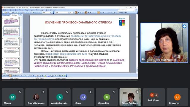 Описание лекции 30.09.2024 Тема: Стресс и саморегуляция: проблемы устойчивости личности в неустойчивом мире Розенова Марина Ивановна, доктор психологических наук, профессор, профессор кафедры научных основ экстремальной психологии факультета «Экстремальная психология» МГППУ