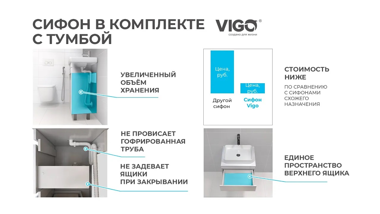 Уникальное решение от Vigo: производство тумб в комплекте с сифоном. Теперь тумбы Vigo будут выпускаться только в комплекте с сифоном. Это уникальное и практичное решение, которое позволит сэкономить место, а также обеспечит удобство использования. Плюсы: - Нет необходимости искать подходящий по всем параметрам сифон; - Модель не скрадывает полезное пространство внутри тумбы любой конфигурации. Теперь в верхнем ящике нет выреза, только полноценное место для хранения. При закрывании не остается зазора и ящик беспрепятственно ходит по направляющим. Тот же момент касается и моделей тумб с дверцами — сифон Vigo обеспечивает увеличенное место для хранения. - Простота установки. Монтаж не требует особенных навыков, а в комплекте идет понятная и подробная инструкция. - Универсальный размер выпуска 40/50 мм; - Максимально удобно. Гофра надежно крепится к кронштейну и не будет провисать. - Комфорт. С помощью кронштейна гофротруба формируется в гидрозатвор, что исключает возможность появления неприятных запахов. - Качество. Сифон Vigo по качественным характеристикам не уступает моделям ведущих брендов, а ценовая политика значительно приятнее, по сравнению с сифонами схожего назначения. Прослужит долго и не вызовет проблем в будущем.