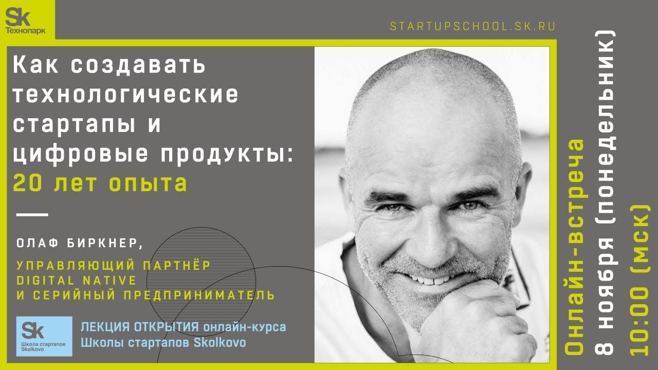 8 ноября 2021 года Школа стартапов Skolkovo проводит 6-й сезон онлайн акселератора - образовательной программы для стартапов ранней стадии https://startupschool.sk.ru/. С традиционной Лекцией Открытия 8 ноября в 10:00 выступит Олаф Биркнер, Управляющий партнёр Digital native и серийный предприниматель. У Олафа на 20-летний опыт в создании и финансировании технологических стартапов, управлении цифровыми бизнес-подразделениями, разработке цифровых продуктов и услуг. Олаф является советником в ряде компаний по конкурентному позиционированию и дифференциации продуктов и предприятий, разработке корпоративных стратегий электронной коммерции и онлайн-маркетинга и выходу. В ходе онлайн акселератора проекты делают несколько важных шагов для развития компании — получают современные методики развития компании и приобретают навыки, которые помогут улучшить основные бизнес показатели проекта и повысят его инвестиционную оценку — комментирует программу Михаил Бялый, трекер-наставник Школы. В наш акселератор могут приходить команды, как с идеей, которую необходимо развить и начать реализовывать, так и стартапы с MVP, которые ищут инвестиции и готовы масштабировать свой бизнес — дополняет Ольга. Программа онлайн акселератора составлена из 6 основных образовательных блоков: 1. Финансы — бизнес модели, unit экономика, финансовая модель проекта. 2. Работа над проектом и продуктом — проектное управление, дорожная карта, traction проекта, Customer journey map. 3. Менеджмент — стратегия и маркетинг, построение команды, юридические аспекты. 4. Инвестиции — коммуникации и питчи, разработка презентации, привлечение инвестиций. 5. Self—management — системное и критическое мышление, саморазвитие. 6. Трек — работа над проектом с опытным наставником. Заканчивает программу Демо — день, который пройдет 02 декабря в Технопарке Сколково и на который будут приглашены венчурные инвесторы, бизнес — ангелы и отраслевые эксперты. Программа пройдет в онлайн формате лекций, консультаций с наставниками и открытых микрофонов - промежуточных питч сессий перед экспертами, на которых проекты получают обратную связь по инвестиционным презентациям. С момента старта онлайн акселератора в 2020 году его прошли более 130 предпринимателей из 14 регионов Российской Федерации. Среди выпускников Школы: проект в сфере финтеха «Казначейские системы» https://corpbank.su/, проект в сфере биомедицины OXYOM https://www.oxyom.ru/, спортивный проект ЮНИБОР https://runibor.com/, проект проверки качества переводов Verifika https://e-verifika.com/, VR компания Twin3D https://twin3d.ru/, приложение мониторинга здоровья Clouddocs https://clouddocs.ru/, проект по созданию альтернативных продуктов питания из микроводорослей Algafood https://algafood.ru/ Мобильное приложение поиск работы и сотрудников по видео "I`m in" https://ru.imin.works/ , компания разработчик безэкранных технологий и устройств WALLRAYS Для участия в онлайн акселераторе необходимо подать заявку и пройти отбор https://startupschool.sk.ru/startup-accelerator.